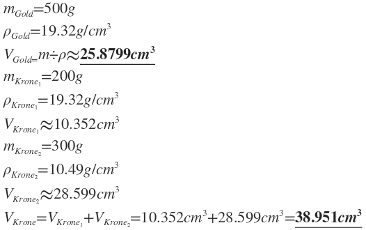 Hier geht es nicht um die Dichte, sondern um das Volumen. Jedoch muss man bedenken, dass das Volumen von der Dichte abhäng. Hier gilt aber je grösser die Dichte, umso kleiner das Volumen! Wie du bereits erwähnt hast, ist die die Dichte von Gold höher als die von Silber, das heisst, die gleiche Masse von Gold und Silber benötigen unterschiedliches Volumen (Gold hat das geringere Volumen). Durch das ausrechnen des Volumens hast du die genaue Verdrängung. Ich rechne es dir mit dem Beispiel, dass die Krone 500g wiegt, davon 200 g Gold sind: