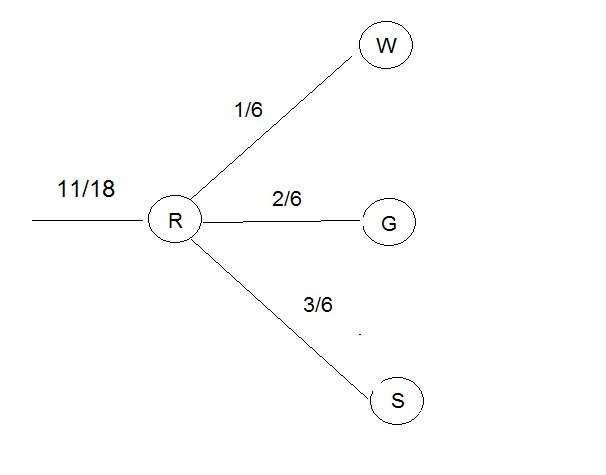 P(R) = 1/6*6/36 + 2/6*18/36 + 3/6*30/36 = 11/18