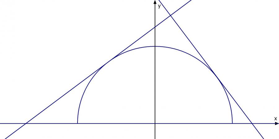 Gegeben ist ein Halbkreis mit dem Radius r. Ein rechtwinkliges Dreieck liegt so, dass der Halbkreisdurchmesser auf die Hypotenuse des Dreiecks fällt und die Katheten den Halbkreis berühren. Der Flächeninhalt des Dreiecks soll ein Minimum annehmen.
