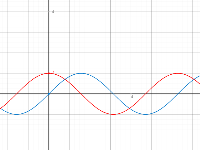 Das wird auch nochmal deutlich, wenn man sich die Funktionen ausdrucken lässt (blau: Sinus, rot: Kosinus):
