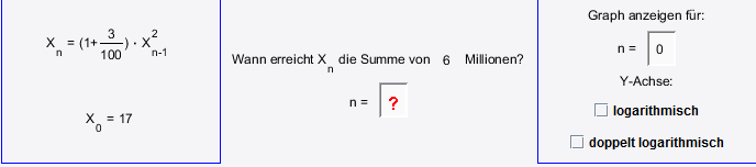 3. Szenario: x n =(1+3 /100 )x 2 n−1 , d.h. die Bank ist so versessen auf Einlagen, dass sie verspricht, den Betrag + Zinsen nochmals mit dem bereits vorliegenden Betrag (in Euro) zu multiplizieren.