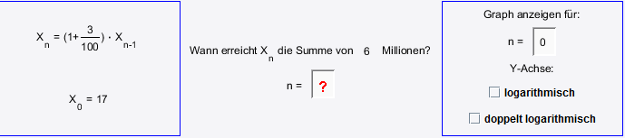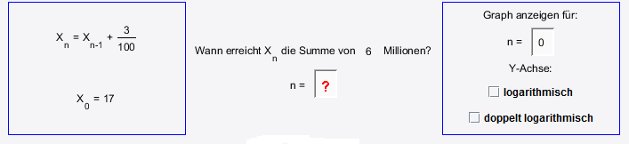 Betrachte das Wachstum von x n für 3 unterschiedliche Szenarien und beantworte die Frage: "In welchem Jahr erreicht x n erstmals die Summe von 6 Millionen Euro?" Benutze das beigefügte Applet und bestimme damit die Antwort experimentell.