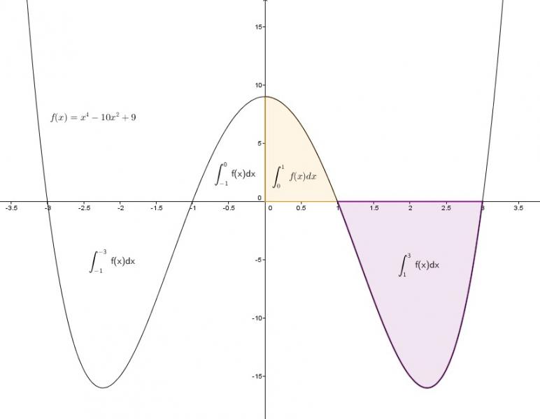 A = 2 \left [ \frac{x^5}{5} - 10\frac{x^3}{3} + 9x \right ]^1_0 + 2\left |\left [ \frac{x^5}{5} - 10\frac{x^3}{3} + 9x \right ]^3_1 \right | \\