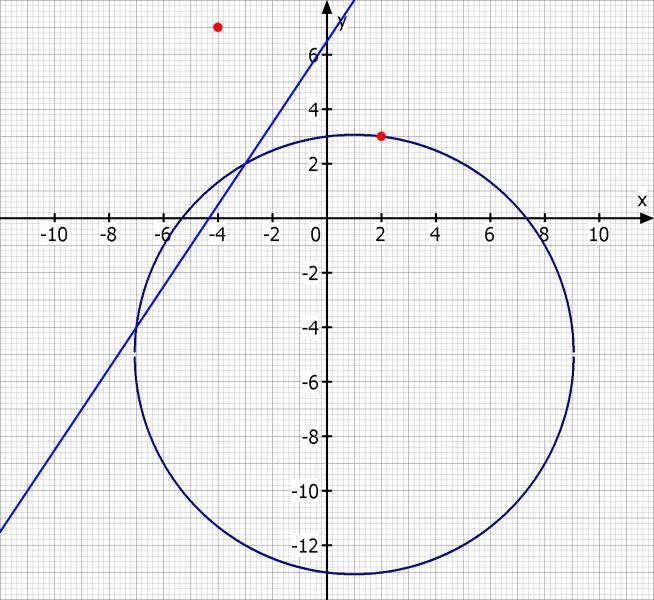 Richtig. Auf einer Mittelsenkrechten zwischen den Punkten. D.h. bestimme die Mittelsenkrechte von A und B und schneide die mit dem Kreis.