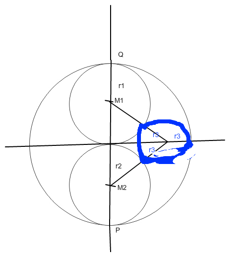 Nun: Ein zusätzlicher müsste M auf der Mittelsenkrechten von P und Q haben. Weiter komme ich dann allerdings nicht sofort. Könnte es sein, dass die 3 Berührpunkte ein gleichseitiges Dreieck bilden?