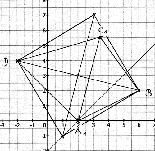 1.4 Unter den Drachenvierecken gibt es eine Raute A2BC2D. Zeichne sie ein und berechne die Koordinaten von A2 und C2 .