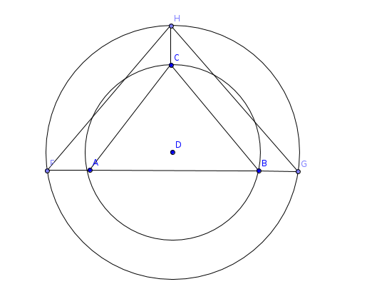 In dieser Zeichnung, deren Winkel nicht der Aufgabenstellung entsprechen, habe ich zuerst A, B und C eingetragen, dann den Umkreismittelpunkt D, und schließlich den großen Umkreis.