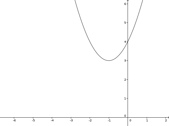 Normalparabel, um eine Stelle nach links verschoben und um 3 Stellen nach oben, also f(x) = (x+1)2 + 3