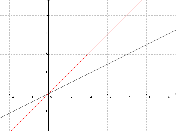Die rote Gerade hat eine Steigung von 100% (eine Einheit nach rechts, eine Einheit nach oben), die schwarze eine Steigung von nur 50% (eine Einheit nach rechts, eine halbe Einheit nach oben).