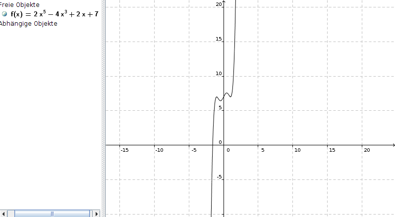 Wir haben natürlich keine Achsensymmetrie vorliegen, da dazu alle Exponenten gerade sein müssten, aber auch keine Punktsymmetrie zum Ursprung, weil uns die +7 diese zunichte macht. Hieße die Funktion f(x) = 2x5 - 4x3 + 2x, dann hätten wir eine Punktsymmetrie zum Ursprung, aber so ist die Funktion lediglich punktsymmetrisch zu (0|7):