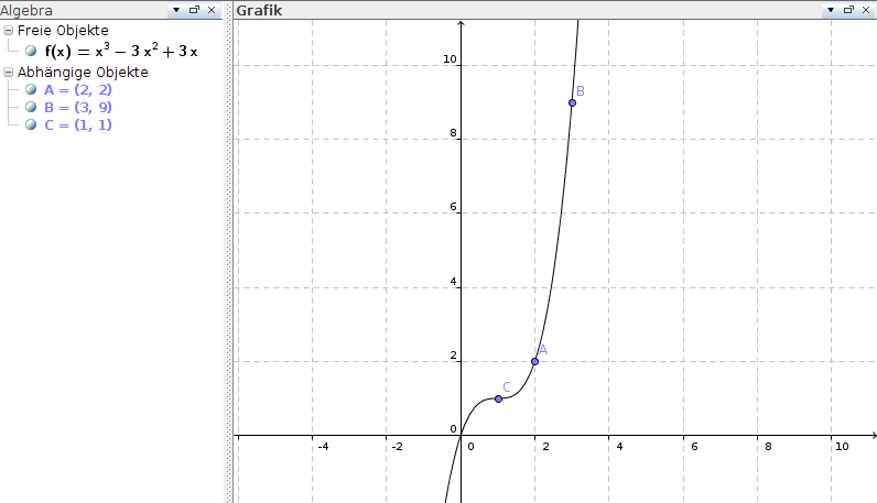2. Ermittle jeweils eine ganzrationale Funktion vom Grad 3 deren Graph durch A(2/2),B(3/9) geht und den Tiefpunkt T(1/1) hat.