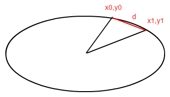 Ich habe eine gegebene Ellipse (x/a)^2+(y/b)^2=1 oder auch x=sin(t)*a y=cos(t)*b und einen Punkt x0,y0 auf dieser Ellipse. Ausgehend von diesem Punkt möchte ich eine Sehne definierter Länge d konstruieren.