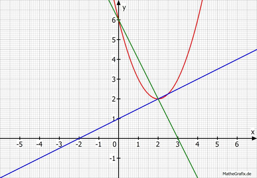 wäre folglich diese Gerade. Tatsächlich geht die für x = 2 durch den Scheitelpunkt und erfüllt damit das Kriterium der Orthogonalität, sowie die anderen gestellten Bedingungen.