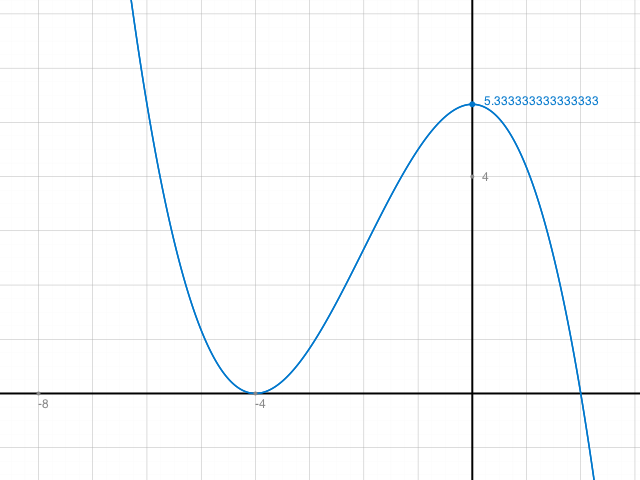 Tiefpunkt bei (-4 | 0) und Hochpunkt bei (0 | 5,3333)