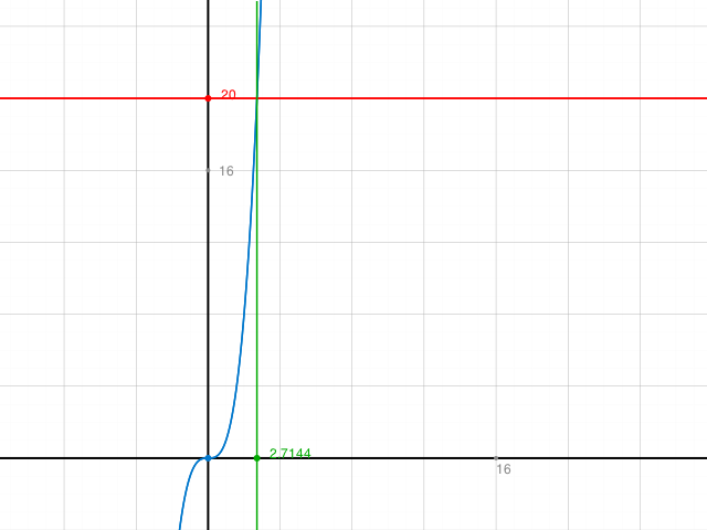 An folgendem Graphen kannst du etwa abschätzen, was passiert. Du musst ihn etwas stauchen. Wähle in x-Richtung eine Einteilung, die mit den Zahlen 0 bis 4 die ganze Heftbreite ausnützt. In y-Richtung nimmst du eine kleinere Skala, damit 20 noch auf dem Blatt liegt.