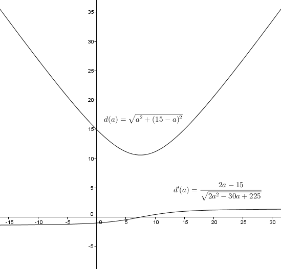 d'(a) = 1/2 (2a^2 - 30a + 225)^{-1/2} (4a - 30)
