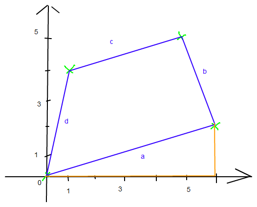 Du siehst das orangen Dreieck...die jeweile Länge kann einfach errechnet werden, in dem von den x-Werten und den y-Werten jeweils die Differenz gebildet wird und dann Pythagoras angewandt wird: