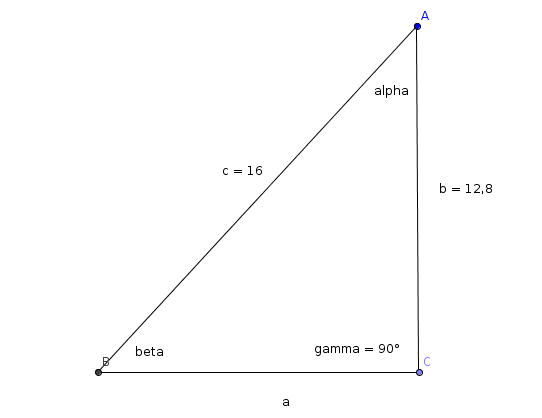 Brauche  Hilfe ! Wär super nett, wenn mir jemand helfen würde.. danke im Voraus :) Die Aufgabe: Bestimme a, Alpha und Beta. Gegeben: b=12,8 cm, c=16 cm und Gamma=90°. Gesucht: a, Alpha und Beta...