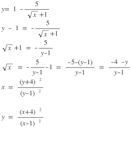y=\quad 1\quad -\frac { 5 }{ \sqrt { x } +1 } \\ y\quad -\quad 1\quad =\quad -\frac { 5 }{ \sqrt { x } +1 } \\ \sqrt { x } +1\quad =\quad -\frac { 5 }{ y-1 } \\ \sqrt { x } \quad =\quad -\frac { 5 }{ y-1 } -1\quad =\quad \frac { -5-(y-1) }{ y-1 } \quad =\quad \frac { -4\quad -y }{ y-1 } \\ x\quad =\quad \frac { (y+4){ \quad }^{ 2 } }{ (y-1){ \quad }^{ 2 } } \\ \\ y\quad =\quad \frac { (x+4){ \quad }^{ 2 } }{ (x-1){ \quad }^{ 2 } } \\ \\ \\ \\