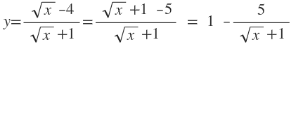 y=\frac { \sqrt { x } -4 }{ \sqrt { x } +1 } =\frac { \sqrt { x } +1\quad -5 }{ \sqrt { x } +1 } \quad =\quad 1\quad -\frac { 5 }{ \sqrt { x } +1 } \\ \\ \\ \\ Ω