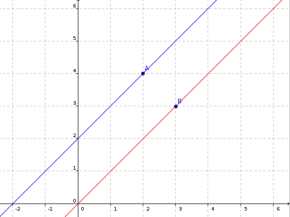Nehme ich aber den gleichen Richtungsvektor, aber einen anderen Stützvektor B, erhalte ich die rote Gerade, die parallel zur blauen ist.