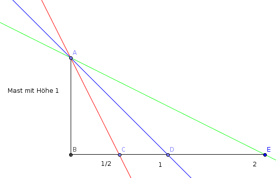 Für den Winkel α, den wir am Punkt C (rot) oder D (blau) oder E (grün) ansetzen, ist die Gegenkathete jeweils der Mast mit der (Standard-)Höhe 1. Die Ankathete ist jeweils die Strecke auf der x-Achse bis zum entsprechenden Punkt.
