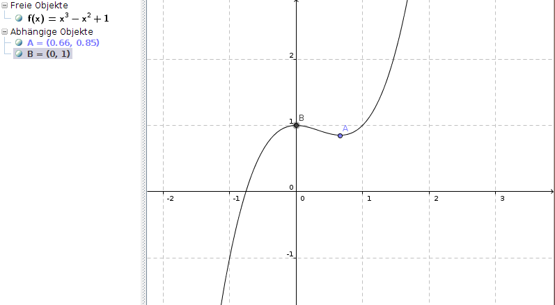 f''(2/3) = 6 * 2/3 - 2 = 4 - 2 = 2 > 0, also Tiefpunkt (A) an (2/3|f(2/3)) = (2/3|8/27 - 4/9 + 1) = (2/3|8/27 - 12/27 + 27/27) =