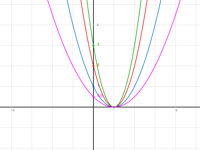 1) und 3) Hier ist mal eine Skizze für a = 0.5, 1, 2 und 3 für y = ax2 - 2ax + a = a(x-1)2