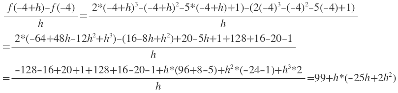 $$ \frac { f ( - 4 + h ) - f ( - 4 ) } { h } = \frac { 2 · ( - 4 + h ) ^ { 3 } - ( - 4 + h ) ^ { 2 } - 5 · ( - 4 + h ) + 1 ) - \left( 2 ( - 4 ) ^ { 3 } - ( - 4 ) ^ { 2 } - 5 ( - 4 ) + 1 \right) } { h } \\ = \frac { 2 · \left( - 64 + 48 h - 12 h ^ { 2 } + h ^ { 3 } \right) - \left( 16 - 8 h + h ^ { 2 } \right) + 20 - 5 h + 1 + 128 + 16 - 20 - 1 } { h } \\ = \frac { - 128 - 16 + 20 + 1 + 128 + 16 - 20 - 1 + h · ( 96 + 8 - 5 ) + h ^ { 2 } · ( - 24 - 1 ) + h ^ { 3 } · 2 } { h } \\ = 99 + h · \left( - 25 h + 2 h ^ { 2 } \right) $$