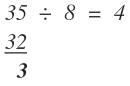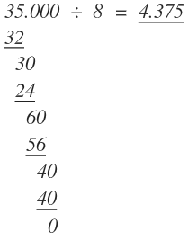 Du siehst, hier ist der Rest null. Wäre er es nicht, so müsste man weiterrechnen (ich nehme die Rechnung 35 / 8 und habe mal angefangen zu lösen...):